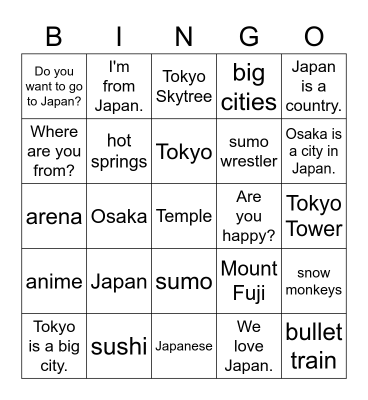 This bingo card has 25 words: Japan, Japanese, Tokyo, Tokyo is a big city., Japan is a country., Do you want to go to Japan?, Where are you from?, I'm from Japan., Are you happy?, sumo, sumo wrestler, arena, Mount Fuji, snow monkeys, hot springs, bullet train, Tokyo Tower, Tokyo Skytree, Osaka is a city in Japan., Osaka, Temple, sushi, anime, big cities and We love Japan..