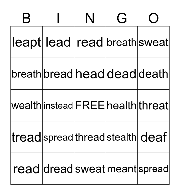 This bingo card has a free space and 24 words: spread, dread, head, read, sweat, leapt, breath, lead, health, thread, dead, wealth, stealth, deaf, bread, meant, threat, read, death, instead, spread, tread, breath and sweat.