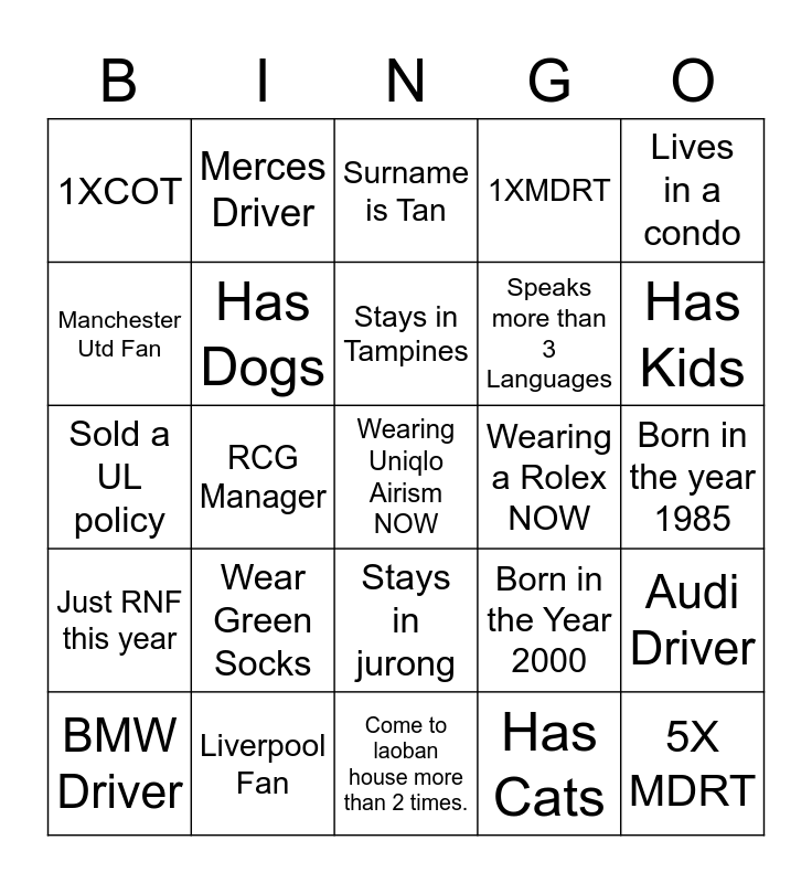 This bingo card has a free space and 24 words: Wear Green Socks, Liverpool Fan, Stays in Tampines, BMW Driver, Lives in a condo, 1XCOT, Manchester Utd Fan, Merces Driver, Wearing a Rolex NOW, Stays in jurong, Speaks more than 3 Languages, Sold a UL policy, Born in the Year 2000, Audi Driver, Has Dogs, Has Cats, Born in the year 1985, Surname is Tan, Has Kids, RCG Manager, 5X MDRT, Just RNF this year, 1XMDRT and Come to laoban house more than 2 times..