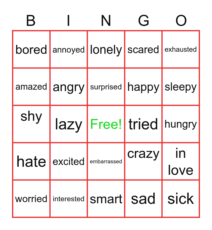 This bingo card has a free space and 24 words: excited, interested, surprised, worried, exhausted, bored, amazed, annoyed, tried, embarrassed, happy, shy, crazy, in love, angry, sad, hungry, lonely, sleepy, lazy, sick, hate, scared and smart.
