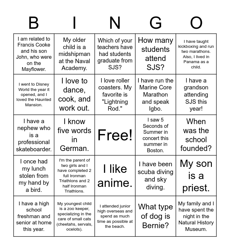 This bingo card has a free space and 24 words: I'm the parent of two girls and I have completed 2 full Ironman Triathlons and 2 half Ironman Triathlons., My youngest child is a zoo keeper, specializing in the care of small cats (cheetahs, servals, ocelots)., I love roller coasters. My favorite is "Lightning Rod.", I have a high school freshman and senior at home this year., I have taught kickboxing and run two marathons. Also, I lived in Panama as a child., I am related to Francis Cooke and his son John, who were on the Mayflower., I went to Disney World the year it opened, and I loved the Haunted Mansion., My older child is a midshipman at the Naval Academy., I saw 5 Seconds of Summer in concert this summer in Boston., I like anime., I have run the Marine Core Marathon and speak Igbo., I have a nephew who is a professional skateboarder., I have been scuba diving and sky diving., My son is a priest., I love to dance, cook, and work out., What type of dog is Bernie?, When was the school founded?, Which of your teachers have had students graduate from SJS?, I have a grandson attending SJS this year!, I know five words in German., My family and I have spent the night in the Natural History Museum., I once had my lunch stolen from my hand by a bird., How many students attend SJS? and I attended junior high overseas and spend as much time as possible at the beach..