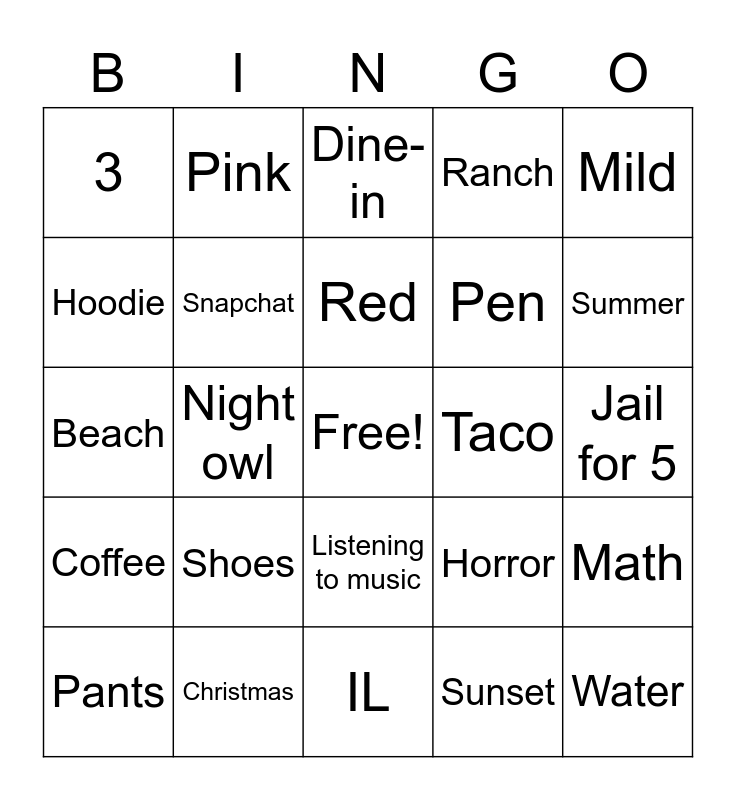 This bingo card has a free space and 24 words: Shoes, Christmas, Red, Pants, Mild, 3, Hoodie, Pink, Taco, Listening to music, Pen, Beach, Horror, Math, Snapchat, Sunset, Jail for 5, Dine-in, Summer, Night owl, Water, Coffee, Ranch and IL.
