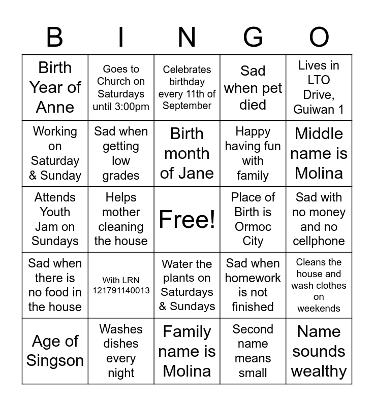This bingo card has a free space and 25 words: With LRN 121791140013, Family name is Molina, Birth month of Jane, Age of Singson, Lives in LTO Drive, Guiwan 1, Birth Year of Anne, Working on Saturday & Sunday, Goes to Church on Saturdays until 3:00pm, Place of Birth is Ormoc City, Water the plants on Saturdays & Sundays, Happy having fun with family, Attends Youth Jam on Sundays, Sad when homework is not finished, Cleans the house and wash clothes on weekends, Sad when getting low grades, Happy to sing & dance, Sad with no money and no cellphone, Celebrates birthday every 11th of September, Middle name is Molina, Helps mother cleaning the house, Name sounds wealthy, Washes dishes every night, Sad when there is no food in the house, Sad when pet died and Second name means small.