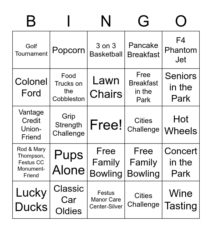 This bingo card has a free space and 24 words: Pups Alone, Classic Car Oldies, Lawn Chairs, Lucky Ducks, F4 Phantom Jet, Golf Tournament, Colonel Ford, Popcorn, Cities Challenge, Free Family Bowling, Free Breakfast in the Park, Vantage Credit Union-Friend, Free Family Bowling, Concert in the Park, Food Trucks on the Cobbleston, Cities Challenge, Hot Wheels, 3 on 3 Basketball, Seniors in the Park, Grip Strength Challenge, Wine Tasting, Rod & Mary Thompson, Festus CC Monument-Friend, Pancake Breakfast and Festus Manor Care Center-Silver.