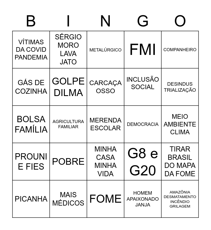 This bingo card has 25 words: POBRE, FOME, CARCAÇA OSSO, PICANHA, COMPANHEIRO, VÍTIMAS DA COVID PANDEMIA, GÁS DE COZINHA, SÉRGIO MORO LAVA JATO, DEMOCRACIA, MINHA CASA MINHA VIDA, INCLUSÃO SOCIAL, BOLSA FAMÍLIA, G8 e G20, TIRAR BRASIL DO MAPA DA FOME, GOLPE DILMA, AMAZÔNIA DESMATAMENTO INCÊNDIO GRILAGEM, MEIO AMBIENTE CLIMA, METALÚRGICO, DESINDUS TRIALIZAÇÃO, AGRICULTURA FAMILIAR, MERENDA ESCOLAR, MAIS MÉDICOS, PROUNI E FIES, FMI and HOMEM APAIXONADO JANJA.