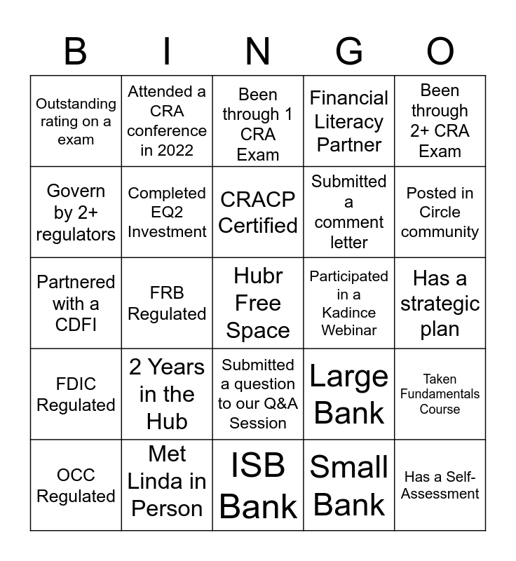 This bingo card has a free space and 24 words: 2 Years in the Hub, Met Linda in Person, CRACP Certified, OCC Regulated, Been through 2+ CRA Exam, Outstanding rating on a exam, Govern by 2+ regulators, Attended a CRA conference in 2022, Participated in a Kadince Webinar, Submitted a question to our Q&A Session, Submitted a comment letter, Partnered with a CDFI, Large Bank, Taken Fundamentals Course, Completed EQ2 Investment, Small Bank, Has a strategic plan, Been through 1 CRA Exam, Posted in Circle community, FRB Regulated, Has a Self- Assessment, FDIC Regulated, Financial Literacy Partner and ISB Bank.