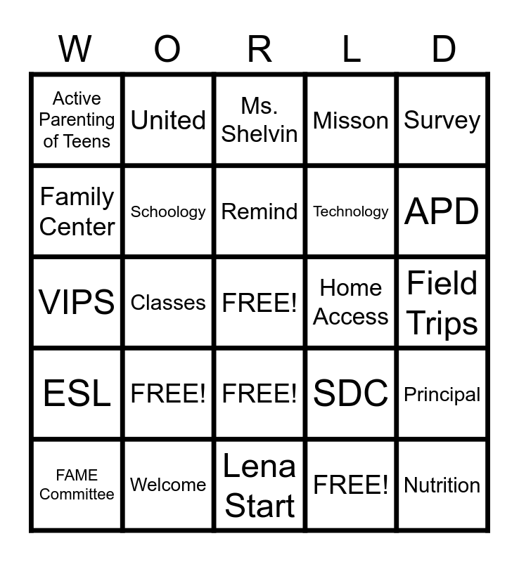 This bingo card has a free space and 24 words: FREE!, Welcome, Remind, FAME Committee, Survey, Active Parenting of Teens, Family Center, United, Home Access, FREE!, Technology, VIPS, SDC, Principal, Schoology, FREE!, Field Trips, Ms. Shelvin, APD, Classes, Nutrition, ESL, Misson and Lena Start.