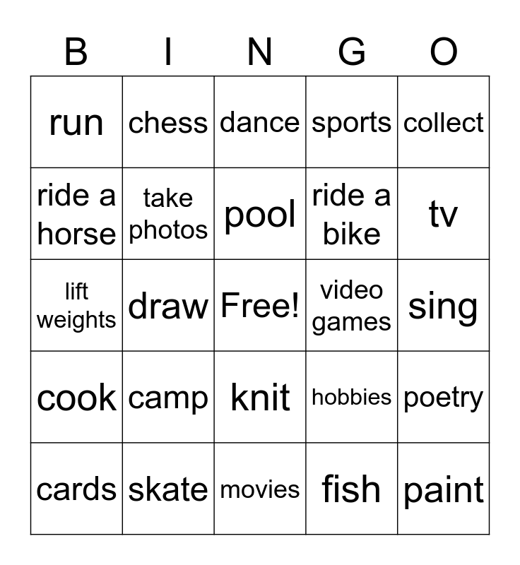 This bingo card has a free space and 24 words: camp, skate, pool, cards, collect, run, ride a horse, chess, video games, knit, ride a bike, lift weights, hobbies, poetry, take photos, fish, sing, dance, tv, draw, paint, cook, sports and movies.