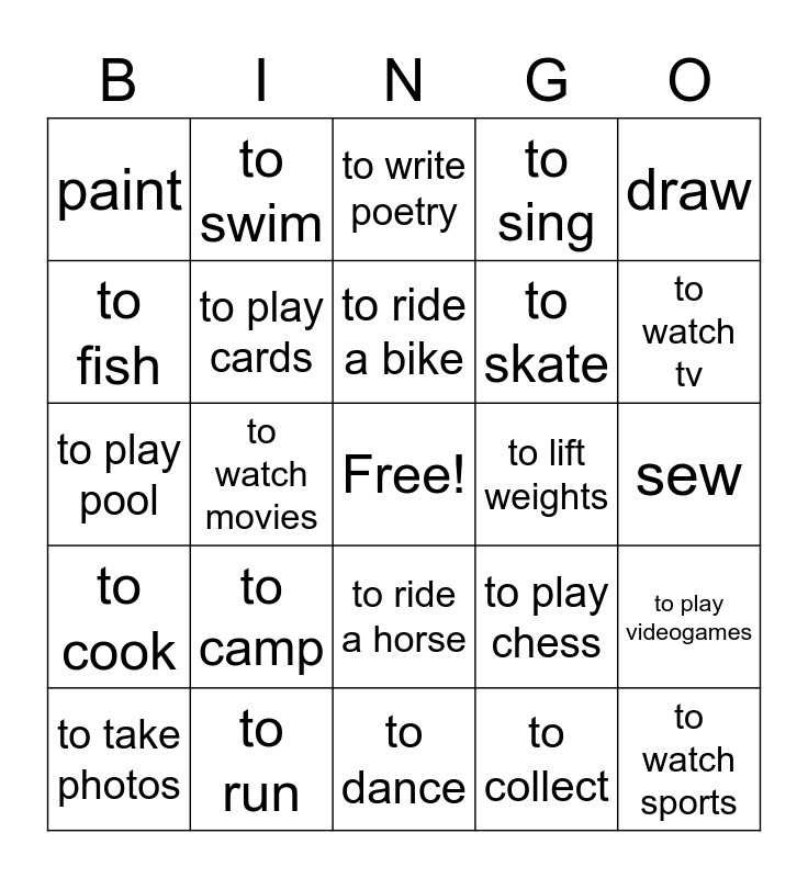This bingo card has a free space and 24 words: to camp, to run, to ride a bike, to take photos, draw, paint, to fish, to swim, to lift weights, to ride a horse, to skate, to play pool, to play chess, to play videogames, to play cards, to collect, sew, to write poetry, to watch tv, to watch movies, to watch sports, to cook, to sing and to dance.
