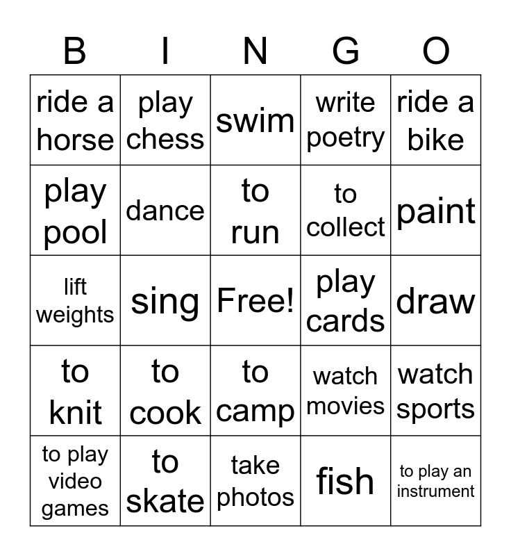 This bingo card has a free space and 24 words: to cook, to skate, to run, to play video games, ride a bike, ride a horse, play pool, play chess, play cards, to camp, to collect, lift weights, watch movies, watch sports, dance, fish, draw, swim, paint, sing, to play an instrument, to knit, write poetry and take photos.