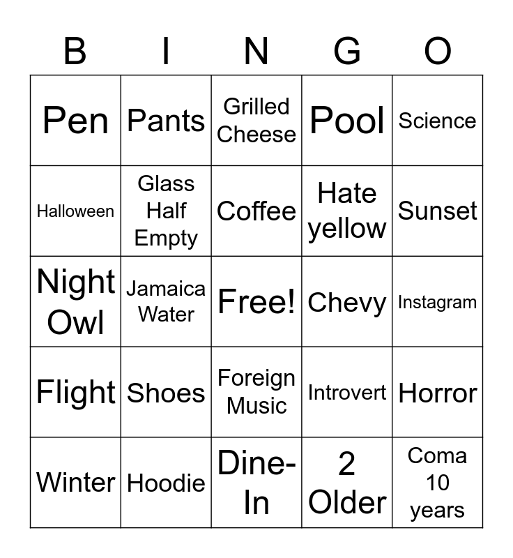 This bingo card has a free space and 24 words: Winter, Shoes, Coffee, 2 Older, Science, Pen, Pants, Grilled Cheese, Chevy, Instagram, Night Owl, Glass Half Empty, Introvert, Horror, Halloween, Hoodie, Dine-In, Pool, Sunset, Flight, Jamaica Water, Foreign Music, Hate yellow and Coma 10 years.