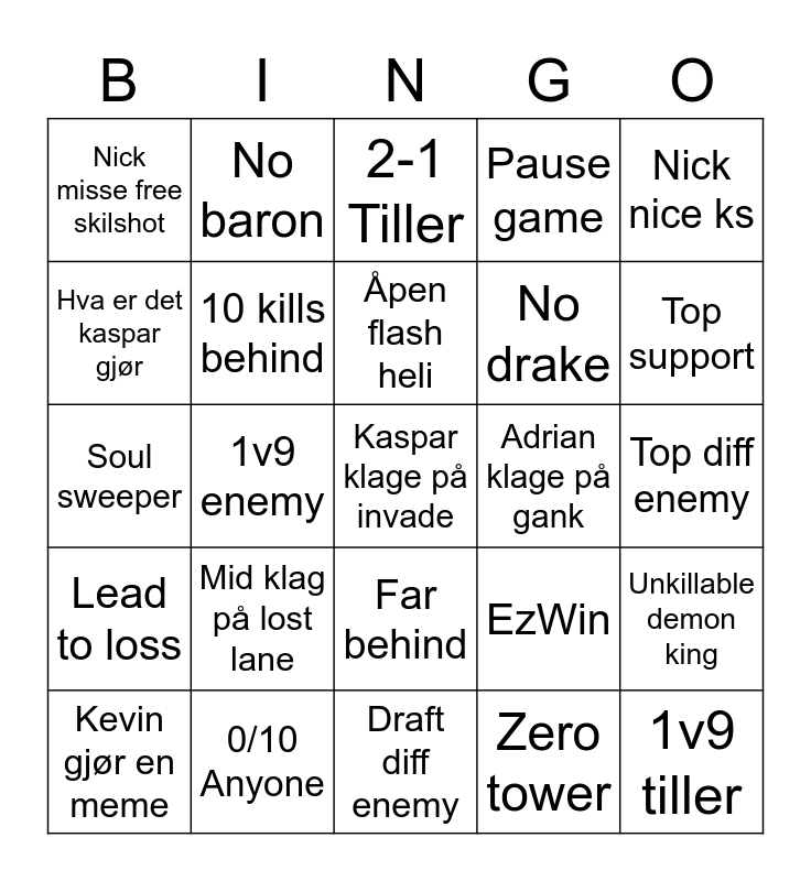 This bingo card has 25 words: Mid klag på lost lane, Draft diff enemy, Åpen flash heli, Kevin gjør en meme, Nick nice ks, Nick misse free skilshot, Hva er det kaspar gjør, No baron, Adrian klage på gank, Far behind, No drake, Soul sweeper, EzWin, Unkillable demon king, 10 kills behind, 1v9 tiller, Top diff enemy, 2-1 Tiller, Top support, 1v9 enemy, Kaspar klage på invade, 0/10 Anyone, Lead to loss, Pause game and Zero tower.