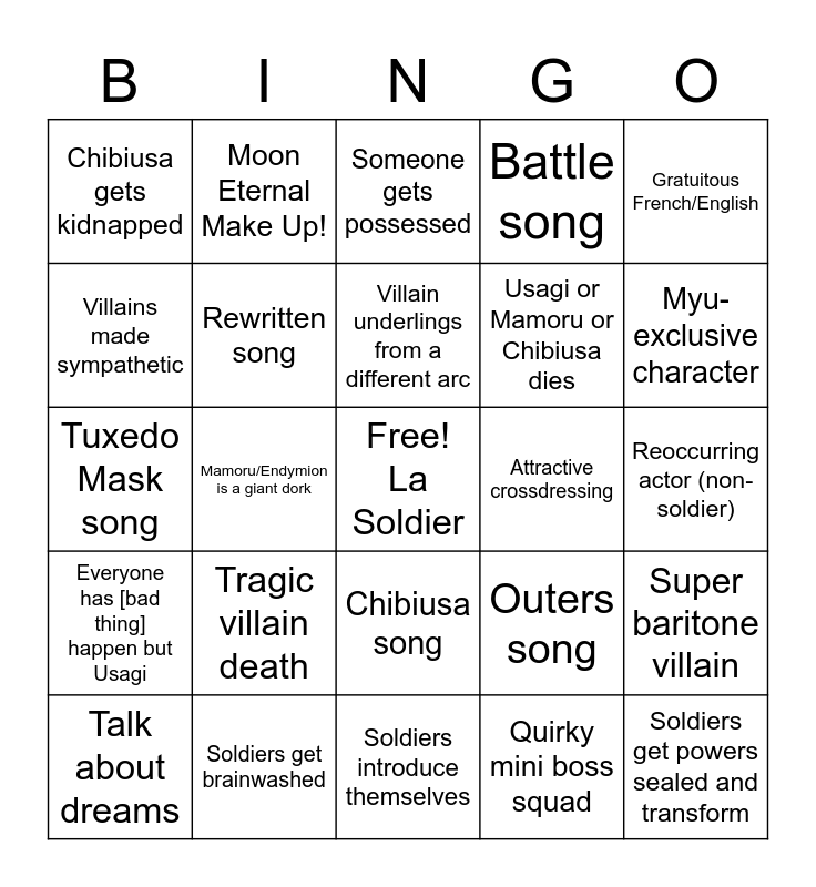 This bingo card has a free space and 40 words: Soldiers hide something for Moon's own good, Tuxedo Mask song, All the soldiers die, Rewritten song, Soldiers get brainwashed, Chibiusa song, Villain underlings from a different arc, Multiple encores, Gratuitous French/English, Everyone has [bad thing] happen but Usagi, Mamoru/Endymion is a giant dork, Battle song, Soldiers get powers sealed and transform, Reoccurring actor (non-soldier), Attractive crossdressing, Tragic villain death, Myu-exclusive children, Chibiusa gets kidnapped, Ami tries to leave, Someone gets possessed, Super baritone villain, Quirky mini boss squad, Usagi or Mamoru or Chibiusa dies, Villains made sympathetic, Whole cast song, Different words sung at the same time, Love song, Puns that don't translate, Villain with a very silly name, Villain with a gem or mineral name, Talk about being ordinary, Talk about dreams, Talk about jewels, Outers song, Myu-exclusive character, Soldiers introduce themselves, Show within a show, Villain song, Moon Eternal Make Up! and Moon sacrifices herself.