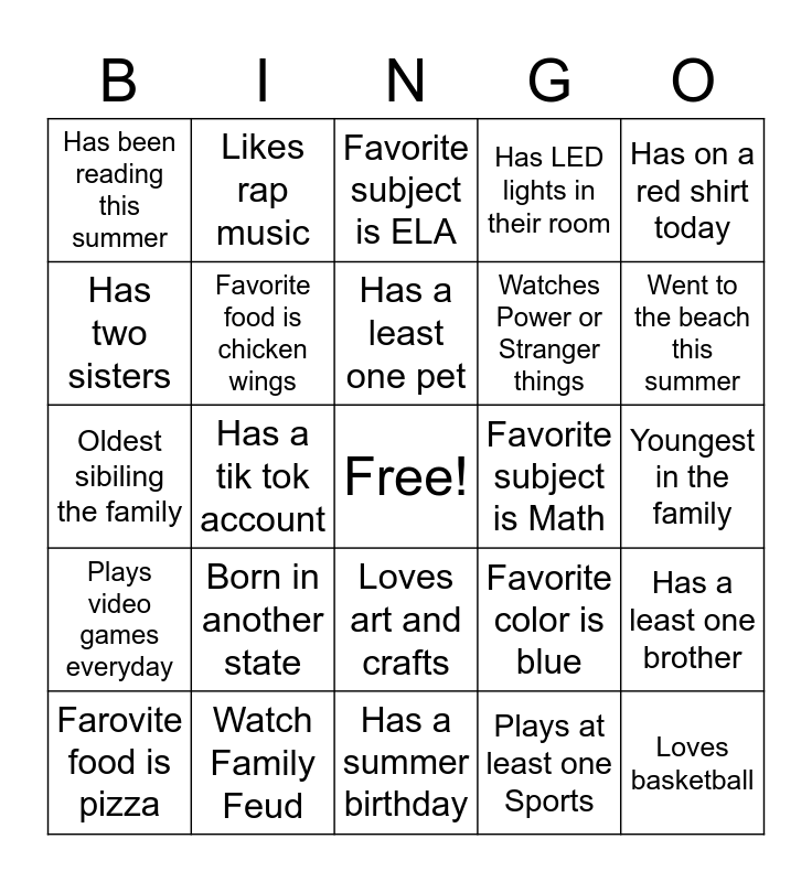 This bingo card has a free space and 24 words: Farovite food is pizza, Born in another state, Has a least one pet, Plays at least one Sports, Has on a red shirt today, Has been reading this summer, Likes rap music, Favorite subject is ELA, Favorite subject is Math, Youngest in the family, Oldest sibiling the family, Favorite food is chicken wings, Favorite color is blue, Has a least one brother, Has two sisters, Watch Family Feud, Has a summer birthday, Has LED lights in their room, Went to the beach this summer, Plays video games everyday, Has a tik tok account, Loves art and crafts, Watches Power or Stranger things and Loves basketball.