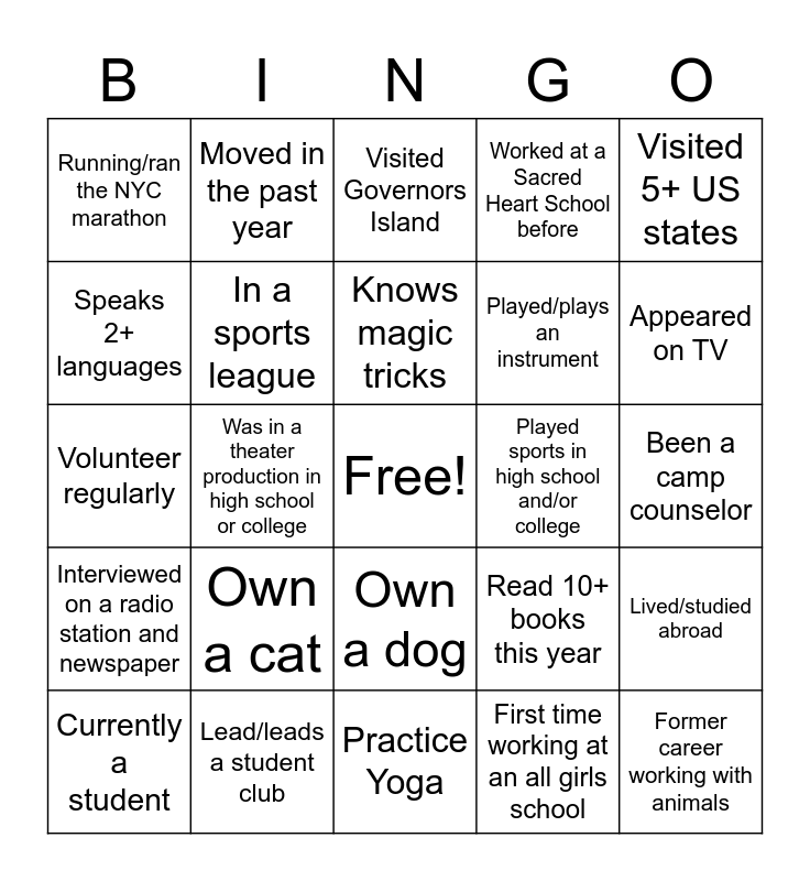 This bingo card has a free space and 24 words: Own a cat, Lead/leads a student club, Knows magic tricks, Currently a student, Visited 5+ US states, Running/ran the NYC marathon, Speaks 2+ languages, Moved in the past year, Played sports in high school and/or college, Own a dog, Played/plays an instrument, Volunteer regularly, Read 10+ books this year, Lived/studied abroad, In a sports league, First time working at an all girls school, Been a camp counselor, Visited Governors Island, Appeared on TV, Was in a theater production in high school or college, Former career working with animals, Interviewed on a radio station and newspaper, Worked at a Sacred Heart School before and Practice Yoga.