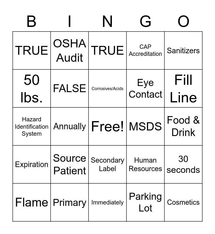 This bingo card has a free space and 27 words: Human Resources, Flammables, Eye Contact, Immediately, 50 lbs., TRUE, OSHA Audit, Expiration, MSDS, 30 seconds, Hazard Identification System, CAP Accreditation, Flame, Primary, Fill Line, Emergency Preparedness Plan, FALSE, Corrosives/Acids, Source Patient, TRUE, Food & Drink, Parking Lot, Annually, Cosmetics, Secondary Label, Sanitizers and Bio-Medical Waste Manual.