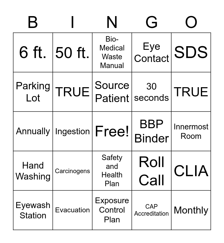 This bingo card has a free space and 24 words: Carcinogens, Evacuation, Source Patient, Eyewash Station, SDS, 6 ft., Parking Lot, 50 ft., BBP Binder, Safety and Health Plan, 30 seconds, Annually, Roll Call, CLIA, TRUE, CAP Accreditation, Innermost Room, Bio-Medical Waste Manual, TRUE, Ingestion, Monthly, Hand Washing, Eye Contact and Exposure Control Plan.