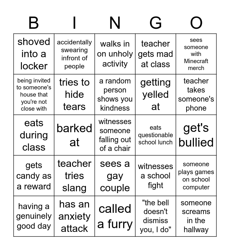 This bingo card has 31 words: called a furry, called emo, barked at, called a slur, shoved into a locker, walks in on unholy activity, tries to hide tears, witnesses a school fight, eats questionable school lunch, "the bell doesn't dismiss you, I do", get's bullied, witnesses someone falling out of a chair, someone screams in the hallway, gets asked for gum, teacher takes someone's phone, isn't allowed to use the washroom, someone plays games on school computer, teacher tries slang, gets candy as a reward, sees a gay couple, sees someone with Minecraft merch, doing he as the teacher is collecting it, having a genuinely good day, accidentally swearing infront of people, getting yelled at, being invited to someone's house that you're not close with, teacher gets mad at class, eats during class, has an anxiety attack, a random person shows you kindness and sharing notes with someone.