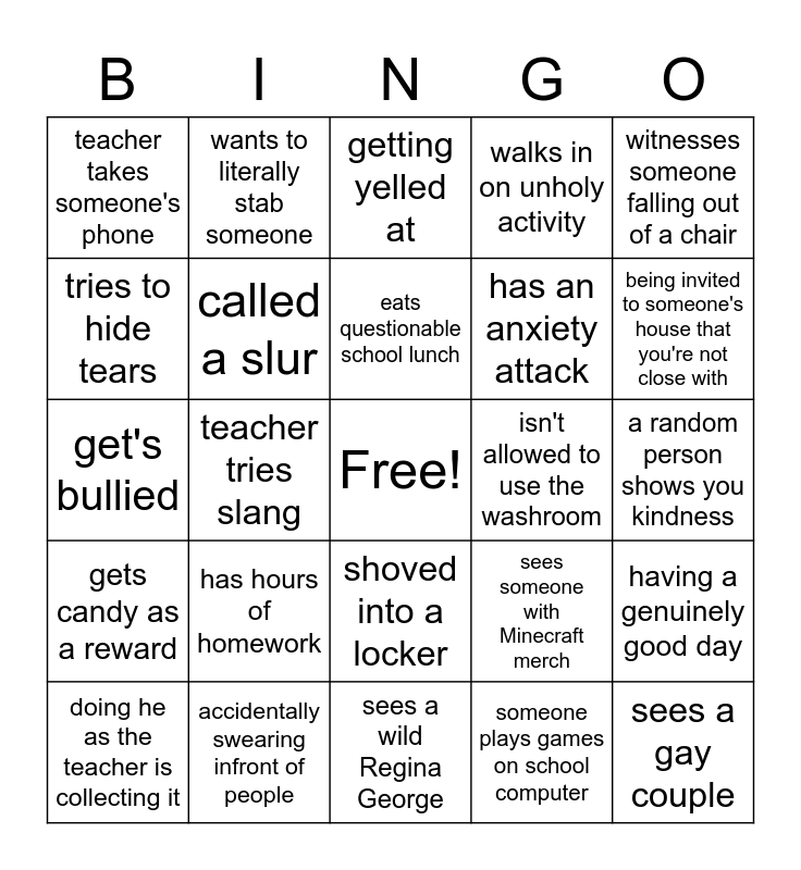 This bingo card has a free space and 35 words: called a furry, called emo, barked at, called a slur, shoved into a locker, walks in on unholy activity, tries to hide tears, witnesses a school fight, eats questionable school lunch, "the bell doesn't dismiss you, I do", get's bullied, witnesses someone falling out of a chair, someone screams in the hallway, gets asked for gum, teacher takes someone's phone, isn't allowed to use the washroom, someone plays games on school computer, teacher tries slang, gets candy as a reward, sees a gay couple, sees someone with Minecraft merch, doing he as the teacher is collecting it, having a genuinely good day, accidentally swearing infront of people, getting yelled at, being invited to someone's house that you're not close with, teacher gets mad at class, eats during class, has an anxiety attack, a random person shows you kindness, sharing notes with someone, sees a wild Regina George, has hours of homework, wants to literally stab someone and has a main character moment.