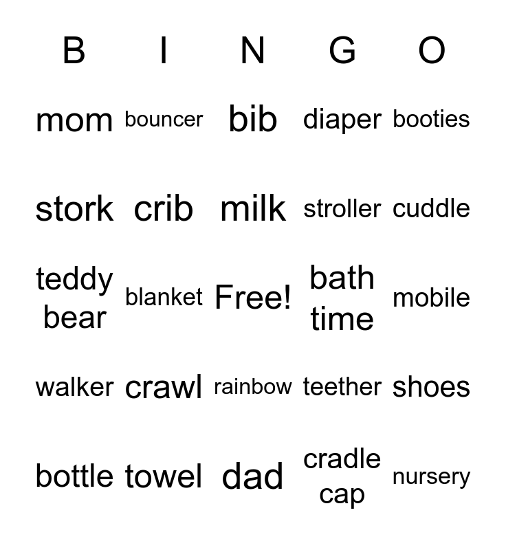This bingo card has a free space and 56 words: pacifier, bottle, baby, mom, dad, swaddle, crib, car seat, stroller, bouncer, diaper, wipes, burp cloth, playpen, mittens, onesie, booties, blanket, Remi, nursery, bath time, rattle, teether, bib, lullaby, milk, nap time, cry, cuddle, high chair, socks, ultrasound, formula, bassinet, mobile, stork, teddy bear, baby bjorn, walker, bouncer, rainbow, peek-a-boo, it's a girl, breast pump, tummy time, crawl, towel, toys, pajamas, sippy cup, cradle cap, newborn, nap time, teether, shoes and labor.
