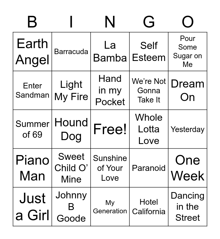 This bingo card has a free space and 30 words: Johnny B Goode, Tutti Frutti, Hound Dog, That’ll Be the Day, Earth Angel, La Bamba, Light My Fire, Sunshine of Your Love, Whole Lotta Love, My Generation, Yesterday, Dancing in the Street, Hotel California, American Pie, Dream On, London Calling, Paranoid, Piano Man, Sweet Child O’ Mine, Pour Some Sugar on Me, Summer of 69, Ace of Spades, Barracuda, We’re Not Gonna Take It, Enter Sandman, Self Esteem, One Week, Just a Girl, Hand in my Pocket and Killing Me Softly with His Song.