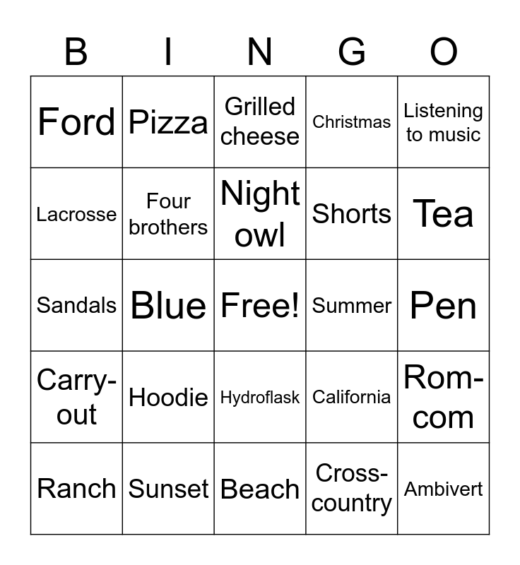 This bingo card has a free space and 24 words: Hoodie, Sunset, Night owl, Ranch, Listening to music, Ford, Lacrosse, Pizza, Summer, Hydroflask, Shorts, Sandals, California, Rom-com, Four brothers, Cross-country, Pen, Grilled cheese, Tea, Blue, Ambivert, Carry-out, Christmas and Beach.
