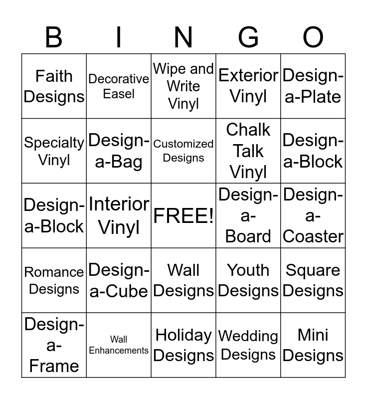 This bingo card has a free space and 24 words: Design-a-Cube, Wall Enhancements, Customized Designs, Design-a-Frame, Design-a-Plate, Faith Designs, Specialty Vinyl, Decorative Easel, Design-a-Board, Wall Designs, Chalk Talk Vinyl, Design-a-Block, Youth Designs, Square Designs, Design-a-Bag, Wedding Designs, Design-a-Coaster, Wipe and Write Vinyl, Design-a-Block, Interior Vinyl, Mini Designs, Romance Designs, Exterior Vinyl and Holiday Designs.