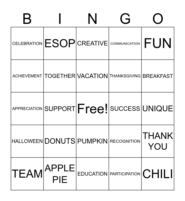 This bingo card has a free space and 24 words: DONUTS, APPLE PIE, VACATION, TEAM, FUN, CELEBRATION, ACHIEVEMENT, ESOP, SUCCESS, PUMPKIN, THANKSGIVING, APPRECIATION, RECOGNITION, THANK YOU, TOGETHER, PARTICIPATION, UNIQUE, CREATIVE, BREAKFAST, SUPPORT, CHILI, HALLOWEEN, COMMUNICATION and EDUCATION.