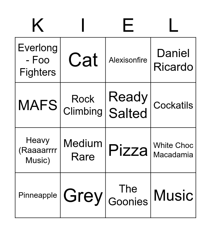 This bingo card has 16 words: Grey, White Choc Macadamia, Alexisonfire, Everlong - Foo Fighters, Heavy (Raaaarrrr Music), Cat, Pizza, The Goonies, MAFS, Rock Climbing, Pinneapple, Daniel Ricardo, Medium Rare, Cockatils, Ready Salted and Music.
