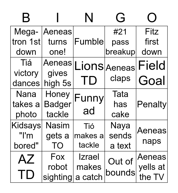This bingo card has 25 words: Nasim gets a TO, Izrael makes a catch, Lions TD, AZ TD, Fitz first down, Mega- tron 1st down, Tiá victory dances, Aeneas turns one!, Tata has cake, Tió makes a tackle, Aeneas claps, Nana takes a photo, Naya sends a text, Aeneas naps, Aeneas gives high 5s, Aeneas yells at the TV, Penalty, Fumble, Field Goal, Honey Badger tackle, Funny ad, Fox robot sighting, Kidsays "I'm bored", #21 pass breakup and Out of bounds.