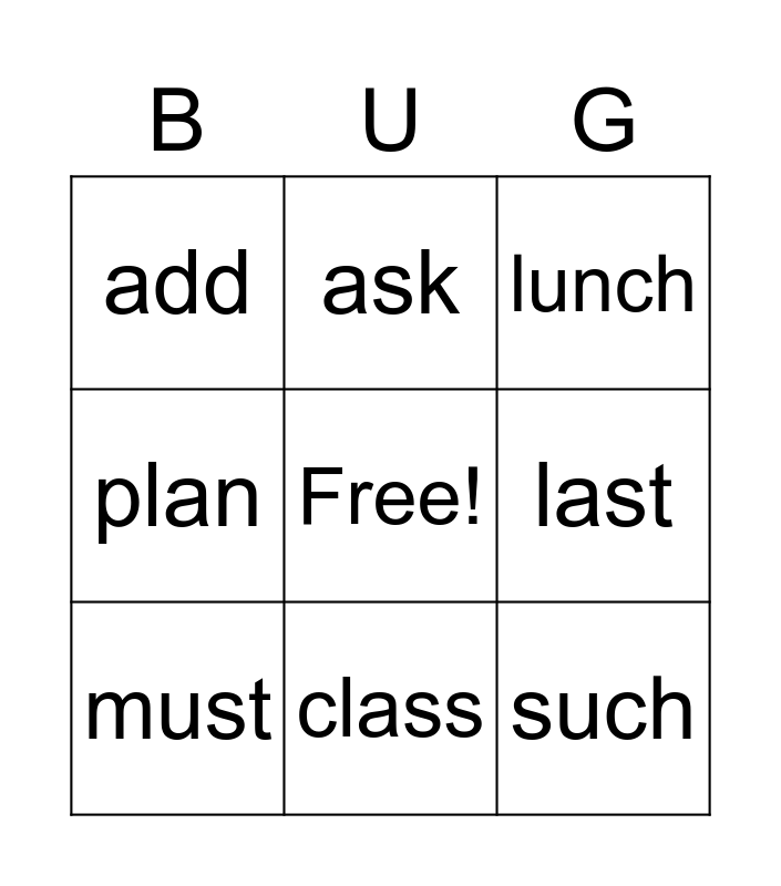This bingo card has a free space and 8 words: last, lunch, ask, must, add, such, plan and class.