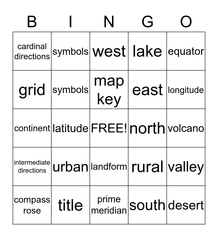 This bingo card has a free space and 24 words: urban, title, map key, compass rose, equator, cardinal directions, grid, symbols, north, landform, east, continent, rural, valley, symbols, south, volcano, west, longitude, latitude, desert, intermediate directions, lake and prime meridian.