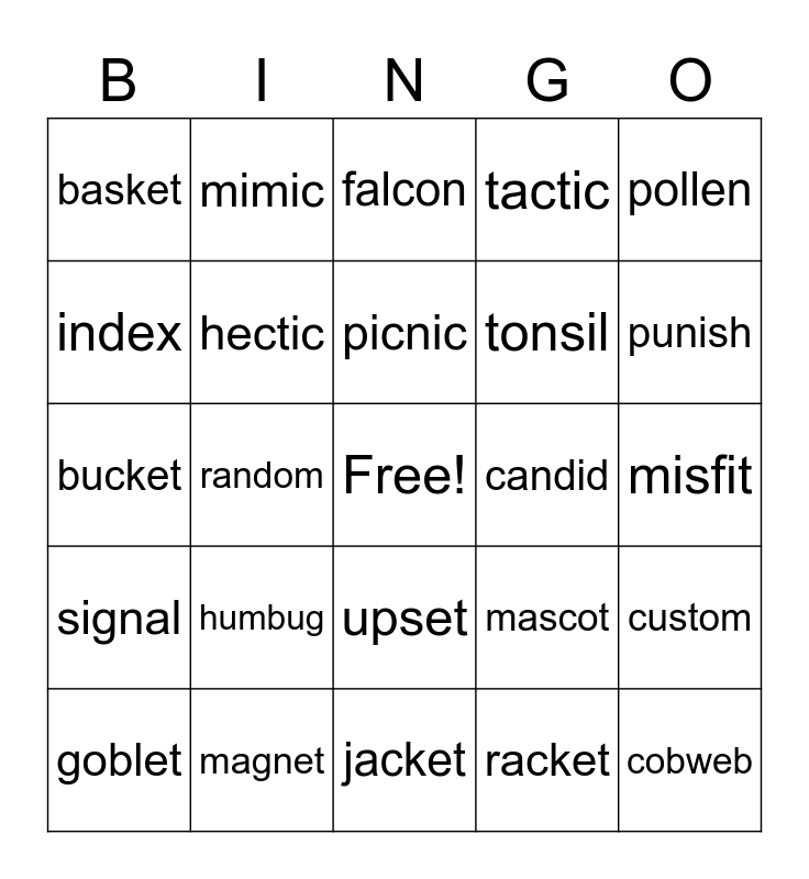 This bingo card has a free space and 24 words: humbug, magnet, picnic, goblet, pollen, basket, index, mimic, candid, upset, tonsil, bucket, mascot, custom, hectic, racket, misfit, falcon, punish, random, cobweb, signal, tactic and jacket.