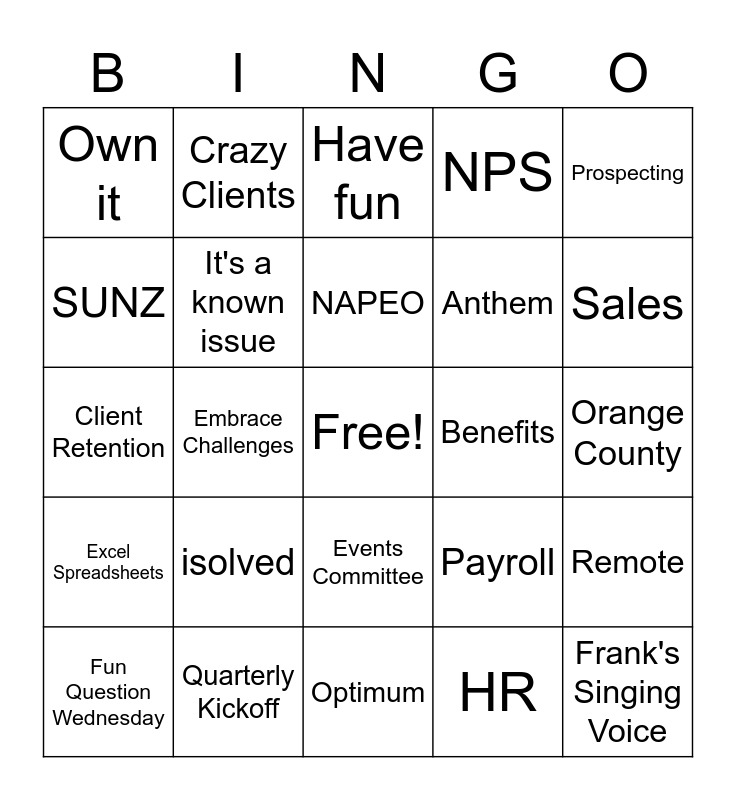 This bingo card has a free space and 31 words: Optimum, We/Me, Embrace Challenges, Be extraordinary, Own it, Have fun, It's a known issue, Payroll, Benefits, HR, Orange County, Frank's Singing Voice, Teams, Accounting, Sales, Kevin, Remote, isolved, Excel Spreadsheets, Events Committee, Prospecting, Mindful Tuesdays, Fun Question Wednesday, Crazy Clients, Anthem, SUNZ, NPS, Client Retention, Quarterly Kickoff, NAPEO and Angels Game.
