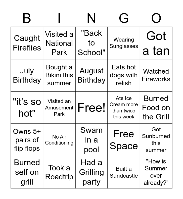 This bingo card has a free space and 25 words: No Air Conditioning, Had a Grilling party, August Birthday, Burned self on grill, Got a tan, Caught Fireflies, July Birthday, Visited a National Park, Ate Ice Cream more than twice this week, Swam in a pool, Eats hot dogs with relish, "it's so hot", Free Space, Got Sunburned this summer, Bought a Bikini this summer, Loves Watermelon, Burned Food on the Grill, "Back to School", Watched Fireworks, Visited an Amusement Park, "How is Summer over already?", Took a Roadtrip, Owns 5+ pairs of flip flops, Wearing Sunglasses and Built a Sandcastle.