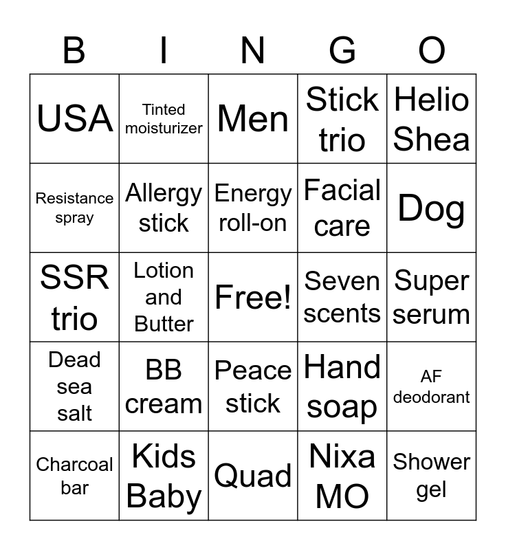 This bingo card has a free space and 35 words: Essentials set, Peppermint magnesium, Renew stick, Allergy stick, Peace stick, Stick trio, Resistance spray, Uplift spray, Energy roll-on, Renew roll-on, SSR trio, Helio Shea, Skin relief, Unscented items, USA, Seven scents, Nixa MO, Lotion and Butter, Dead sea salt, Shower gel, Hand soap, Charcoal bar, AF deodorant, Kids Baby, Men, Dog, Host special, Cherry almond, Facial care, Super serum, Boosters, Quad, BB cream, Tinted moisturizer and Mineral makeup.
