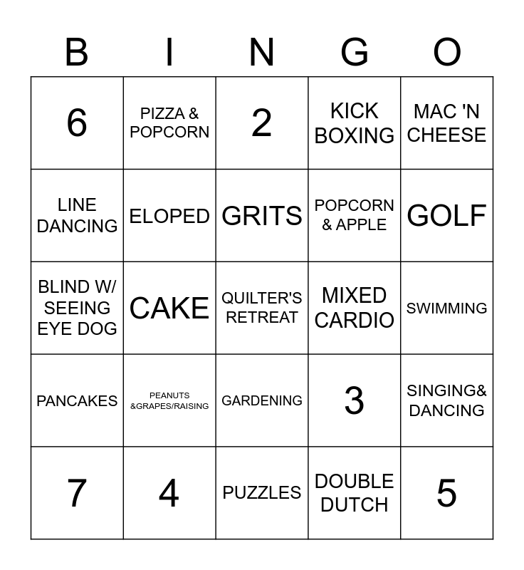 This bingo card has a free space and 24 words: PEANUTS &GRAPES/RAISING, 4, GRITS, 7, MAC 'N CHEESE, 6, LINE DANCING, PIZZA & POPCORN, MIXED CARDIO, GARDENING, POPCORN & APPLE, BLIND W/ SEEING EYE DOG, 3, SINGING& DANCING, ELOPED, DOUBLE DUTCH, SWIMMING, 2, GOLF, CAKE, 5, PANCAKES, KICK BOXING and PUZZLES.