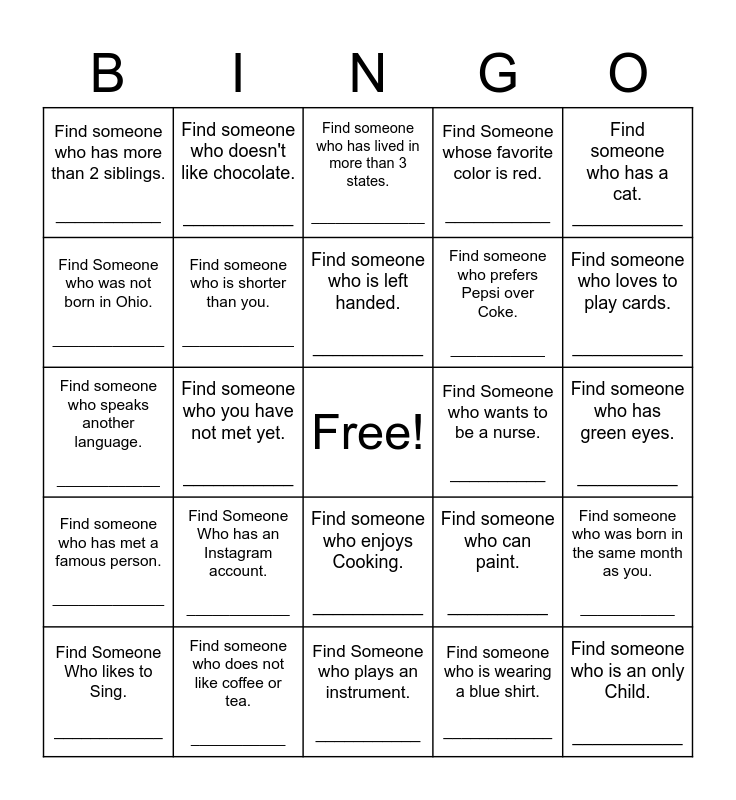 This bingo card has a free space and 25 words: Find Someone Who has an Instagram account. ____________, Find Someone who plays an instrument. ___________, Find someone who is left handed. ___________, Find Someone Who likes to Sing. ____________, Find someone who has a cat. ___________, Find someone who has more than 2 siblings. ___________, Find Someone who was not born in Ohio. _____________, Find someone who doesn't like chocolate. ___________, Find Someone who wants to be a nurse. __________, Find someone who enjoys Cooking. ___________, Find someone who prefers Pepsi over Coke. ___________, Find someone who speaks another language. ____________, Find someone who can paint. __________, Find someone who was born in the same month as you. ___________, Find someone who is shorter than you. _____________, Find someone who has been on a vacation this year. ___________, Find someone who has green eyes. __________, Find someone who has lived in more than 3 states. ______________, Find someone who loves to play cards. ___________, Find someone who you have not met yet. ___________, Find someone who is an only Child. ___________, Find someone who does not like coffee or tea. ___________, Find someone who has met a famous person. _____________, Find Someone whose favorite color is red. ___________ and Find someone who is wearing a blue shirt. ____________.