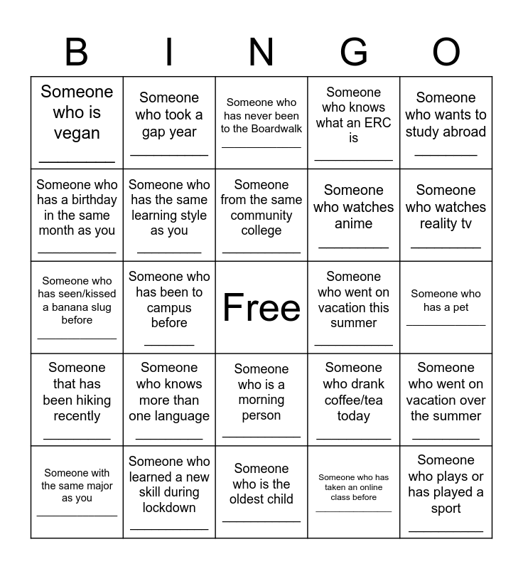 This bingo card has a free space and 24 words: Someone who knows more than one language _________, Someone who learned a new skill during lockdown ___________, Someone from the same community college ___________, Someone with the same major as you ______________, Someone who wants to study abroad ________, Someone who is vegan ________, Someone who has a birthday in the same month as you ___________, Someone who took a gap year __________, Someone who went on vacation this summer ___________, Someone who is a morning person ___________, Someone who watches anime _________, Someone who has seen/kissed a banana slug before _____________, Someone who drank coffee/tea today __________, Someone who went on vacation over the summer _________, Someone who has the same learning style as you _________, Someone who has taken an online class before ________________, Someone who has a pet _____________, Someone who has never been to the Boardwalk _____________, Someone who watches reality tv _________, Someone who has been to campus before _______, Someone who plays or has played a sport __________, Someone that has been hiking recently _________, Someone who knows what an ERC is ___________ and Someone who is the oldest child ___________.