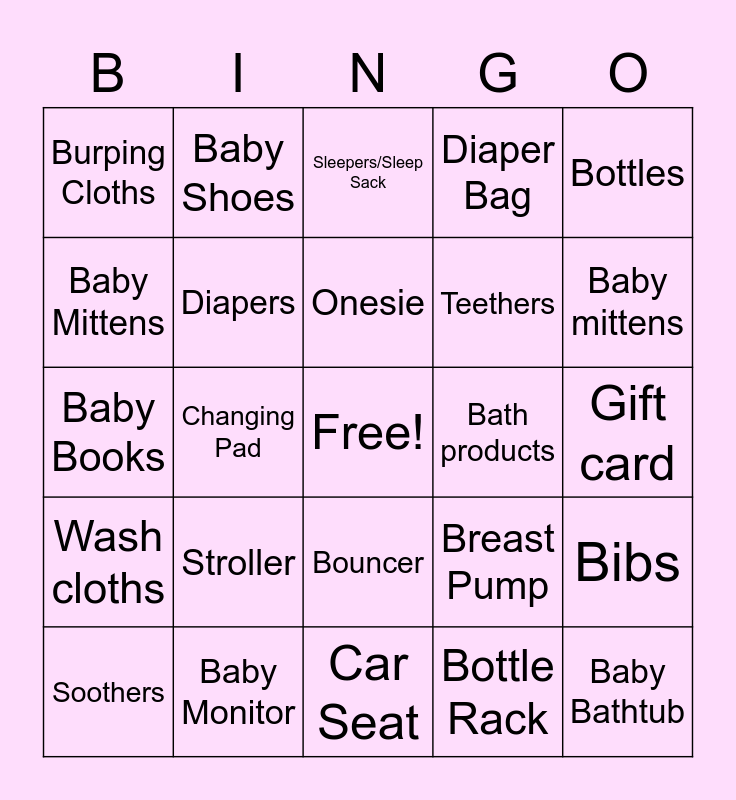 This bingo card has a free space and 25 words: Stroller, Car Seat, Onesie, Soothers, Bottles, Burping Cloths, Baby Mittens, Baby Shoes, Bath products, Bouncer, Teethers, Baby Books, Breast Pump, Bibs, Diapers, Baby Blanket, Gift card, Sleepers/Sleep Sack, Baby mittens, Changing Pad, Baby Bathtub, Baby Monitor, Wash cloths, Diaper Bag and Bottle Rack.