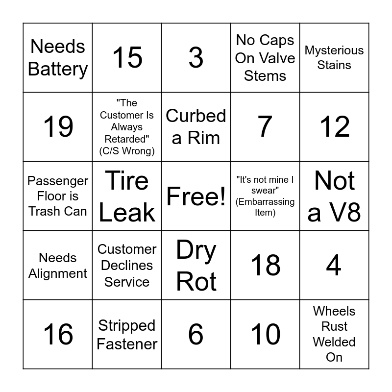 This bingo card has a free space and 41 words: Broken Bolt, Passenger Floor is Trash Can, Chassis Lubrication Mod, "The Customer Is Always Retarded" (C/S Wrong), Stripped Fastener, Dry Rot, Curbed a Rim, 3+ Year Old Tires, Mysterious Stains, Needs Alignment, Tire Leak, No Caps On Valve Stems, Wheels Rust Welded On, Not a V8, "It's not mine I swear" (Embarrassing Item), Customer Declines Service, Condensation in headlights, Needs Battery, 2, 3, 4, 5, 6, 7, 8, 9, 10, 11, 12, 13, 14, 15, 16, 17, 18, 19, 22, 222, 2222, 22222 and 222222.