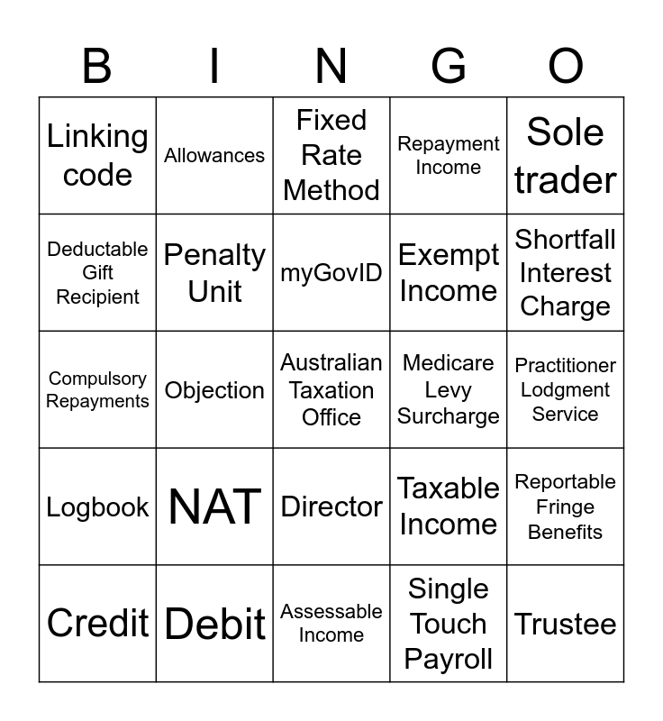 This bingo card has a free space and 27 words: Taxable Income, Gratuities, Exempt Income, Assessable Income, Deductable Gift Recipient, Fixed Rate Method, Allowances, Logbook, Medicare Levy Surcharge, Reportable Fringe Benefits, Compulsory Repayments, Repayment Income, Credit, Debit, Shortfall Interest Charge, Indexation, Penalty Unit, myGovID, NAT, Linking code, Practitioner Lodgment Service, Single Touch Payroll, Objection, Trustee, Director, Sole trader and Residency.