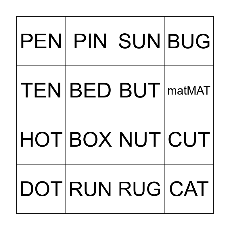 This bingo card has 23 words: CAT, BAT, matMAT, HEN, TEN, PEN, BED, PIN, DOT, FOX, BOX, HOT, NOT, DOG, RUN, FUN, SUN, NUT, BUT, CUT, BUG, RUG and TUG.