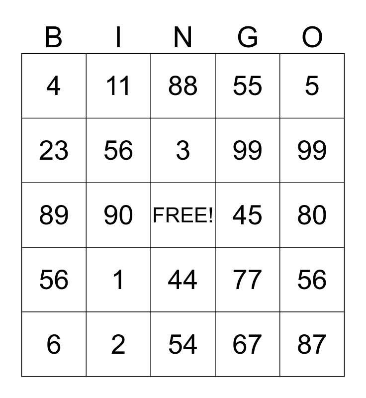 This bingo card has a free space and 24 words: 1, 2, 3, 6, 5, 4, 23, 11, 45, 44, 99, 89, 77, 56, 56, 67, 80, 88, 99, 90, 87, 56, 55 and 54.