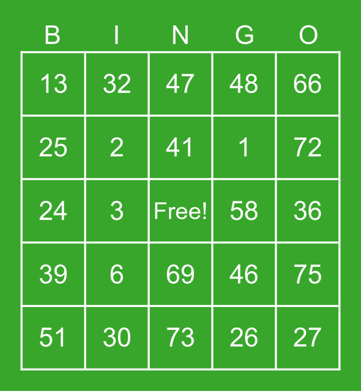 This bingo card has a free space and 24 words: 6, 30, 41, 51, 66, 13, 25, 32, 58, 69, 1, 24, 46, 75, 2, 26, 36, 47, 72, 3, 27, 39, 48 and 73.