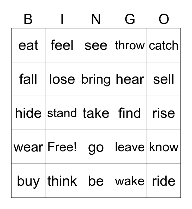 This bingo card has 25 words: Free!, be, bring, buy, catch, eat, fall, feel, find, go, hear, hide, leave, know, lose, ride, rise, see, sell, stand, take, think, wear, throw and wake.