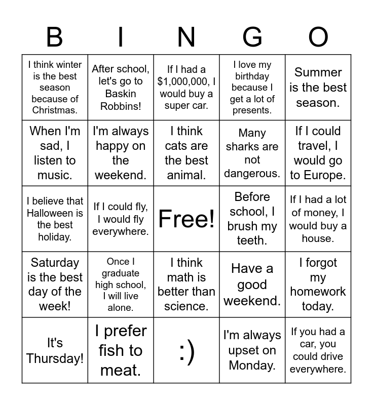 This bingo card has a free space and 24 words: Once I graduate high school, I will live alone., I prefer fish to meat., I think cats are the best animal., It's Thursday!, Summer is the best season., I think winter is the best season because of Christmas., When I'm sad, I listen to music., After school, let's go to Baskin Robbins!, Before school, I brush my teeth., I think math is better than science., Many sharks are not dangerous., I believe that Halloween is the best holiday., Have a good weekend., I forgot my homework today., I'm always happy on the weekend., I'm always upset on Monday., If I had a lot of money, I would buy a house., If I had a $1,000,000, I would buy a super car., If I could travel, I would go to Europe., If I could fly, I would fly everywhere., If you had a car, you could drive everywhere., Saturday is the best day of the week!, I love my birthday because I get a lot of presents. and :).