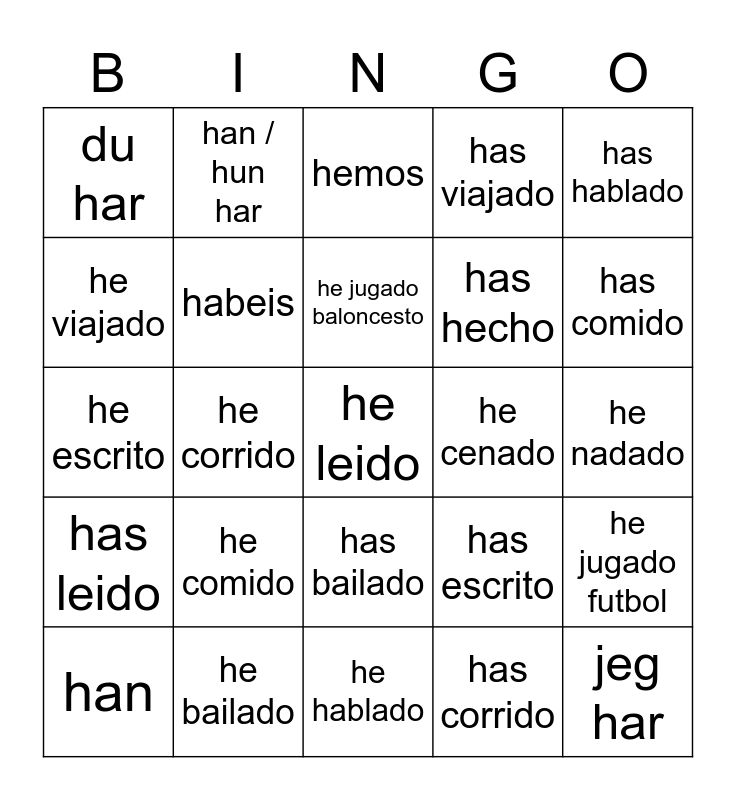 This bingo card has 29 words: han, he jugado tenis, he corrido, jeg har, du har, hemos, habeis, he comido, he cenado, he bailado, he nadado, he leido, he hablado, has corrido, has comido, has cenado, has bailado, has leido, has hablado, he escrito, has escrito, he hecho, has hecho, he viajado, has viajado, han / hun har, he jugado futbol, he jugado baloncesto and he jugado balonmano.