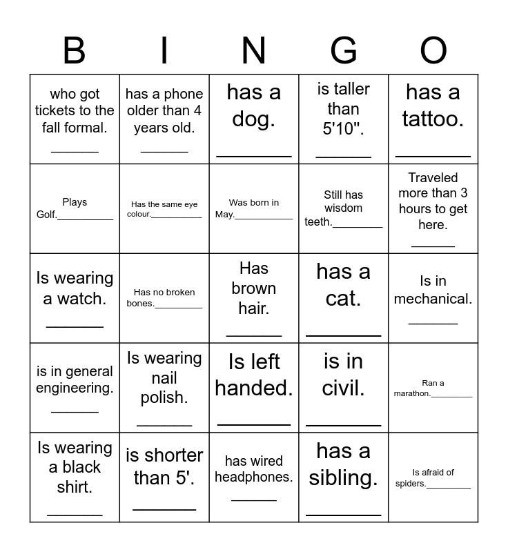 This bingo card has 44 words: Free!, Has brown hair. ______, Has blonde hair. ______, Is wearing a black shirt. ______, Is wearing white shoes. ______, has a sibling. ______, has a dog. ______, has more than two piercings. ______, has a tattoo. ______, is shorter than 5'. ______, is taller than 5'10''. ______, has a cat. ______, Is left handed. ______, Is wearing nail polish. ______, Is in electrical. ______, has wired headphones. ______, Is still purple. ______, Is wearing a watch. ______, Is vegetarian. ______, Traveled more than 3 hours to get here. ______, has a phone older than 4 years old. ______, has an animal other than a cat or a dog. ______, has a size 9 shoe. ______, who got tickets to the fall formal. ______, lives in residence. ______, Is in mechanical. ______, is in environmental. ______, is in industrial. ______, is in civil. ______, is in general engineering. ______, Does not drink milk.______, Ran a marathon._________, Had braces.________, Drives a truck._____, Has no broken bones._________, Knows how to ride a motorcycle._________, Loves country music._______, Is afraid of spiders._________, Was born in May.___________, Plays Golf.__________, Still has wisdom teeth.________, Does not like coffee.___________, Has the same eye colour.___________ and Likes spicy food.____________.