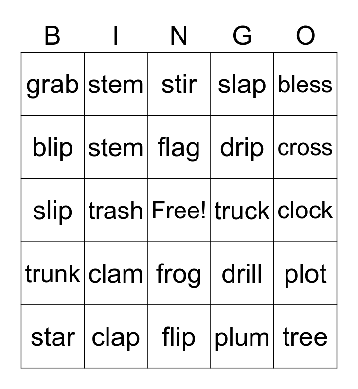 This bingo card has a free space and 24 words: clam, clap, flag, star, bless, grab, blip, stem, truck, frog, drip, slip, drill, plot, stem, plum, clock, stir, cross, trash, tree, trunk, slap and flip.